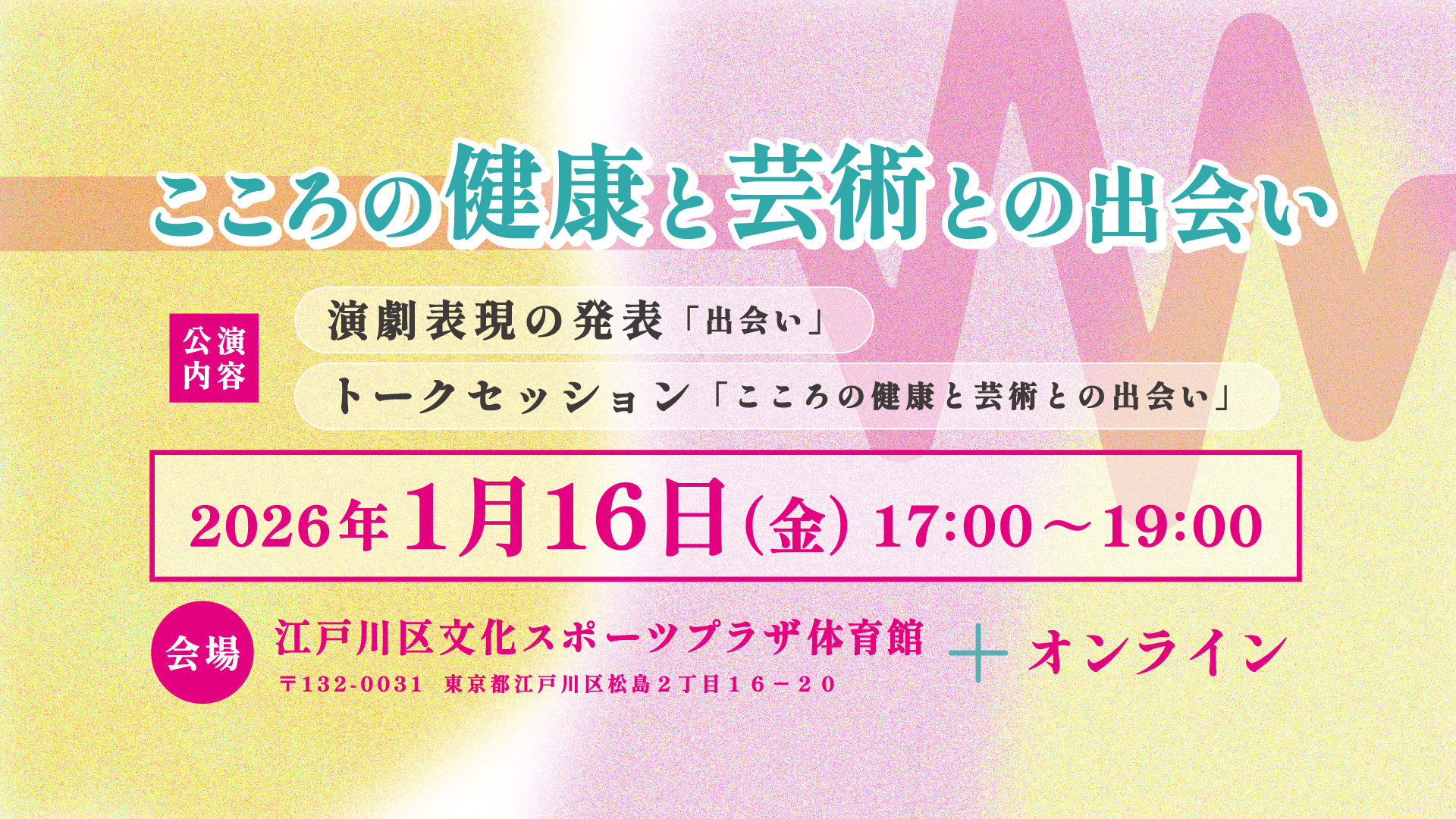 こころの健康と芸術との出会い (12/22/2025) - 演劇表現の発表「出会い」 トークセッション「こころの健康と芸術との出会い」 日時 2026年1月16日(金) 17:00~19:00 会場 江戸川区文化スポーツ… ...